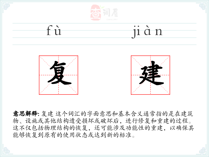 “复建”一词在中文中由“复”和“建”两个字组成。其中,“复”意味着再次或恢复,“建”则指建设或建造。这个词的现代用法主要集中在建筑和工程领域,但其概念在历史上早已存在,如古代城市的重建等。
